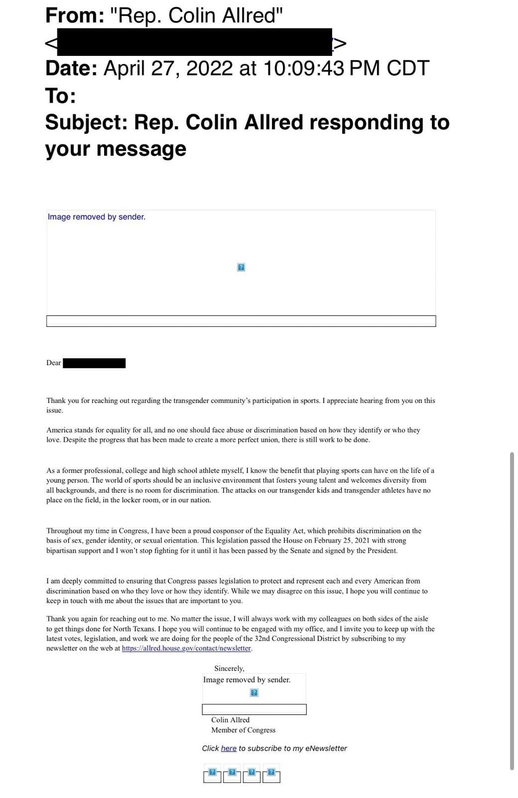 Allred’s record in Congress also includes a vote against the Protection of Women and Girls in Sports Act—which aimed to stop school athletic programs from allowing men to participate in female sports.