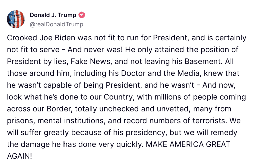 In a response on Truth Social, former President Donald Trump said “Crooked Joe Biden was not fit to run for President, and is certainly not fit to serve – And never was!”