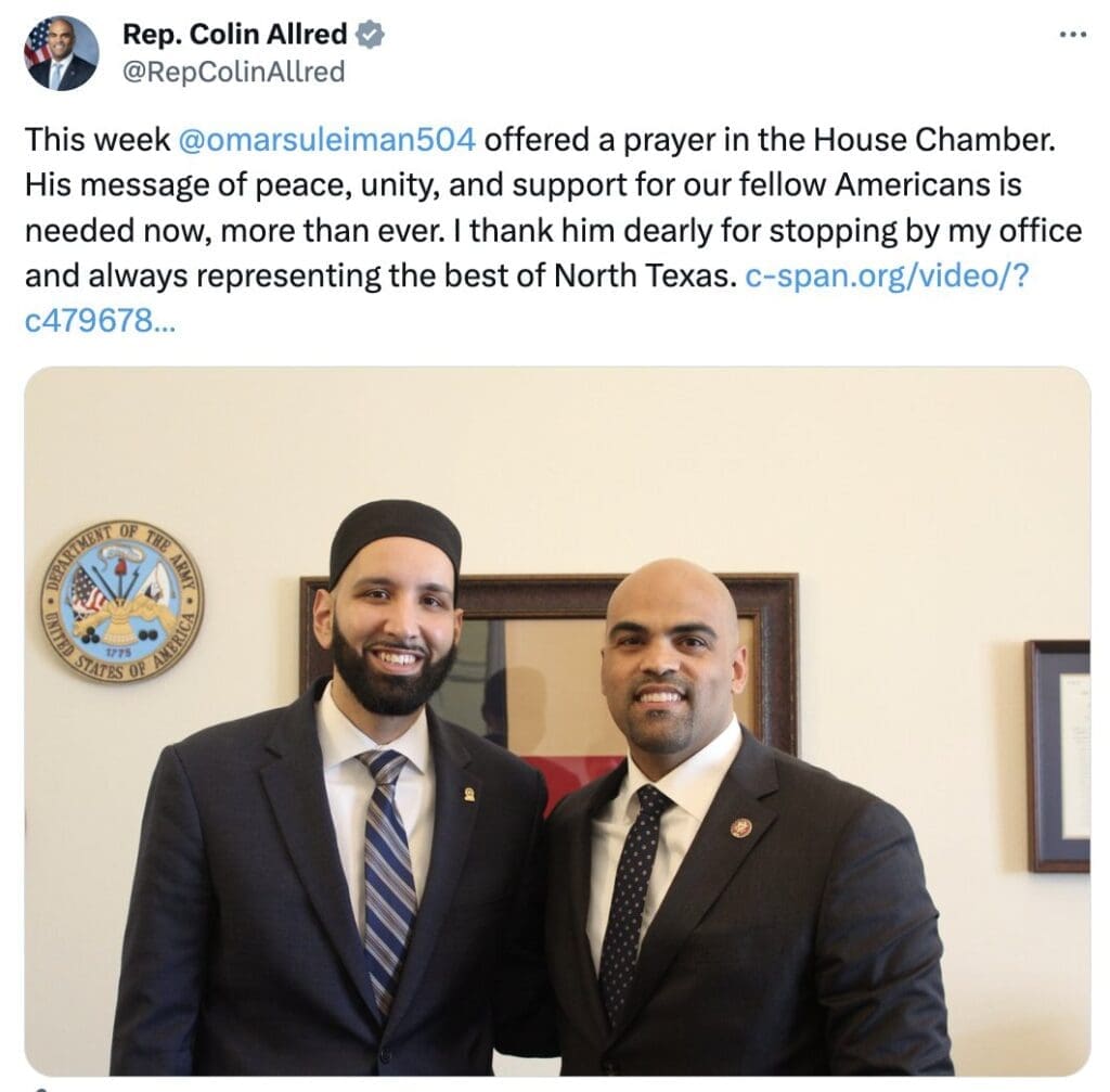 In May 2019, Allred posted a picture on X with Omar Suleiman. Suleiman is a professor at Texas’ Southern Methodist University and has recently shared a slew of pro-Palestine posts.