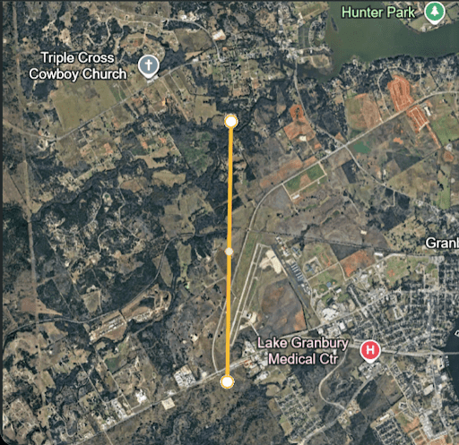 Krottinger’s land is in a peculiar position. He told Texas Scorecard that his property is 2.5 miles away from Project Patriot, a data center and power project development located at 2801 West Highway 377, west of Granbury, that covers more than 2,000 acres. Its developer is Bilateral Energy. He shared a map image showing the distance.