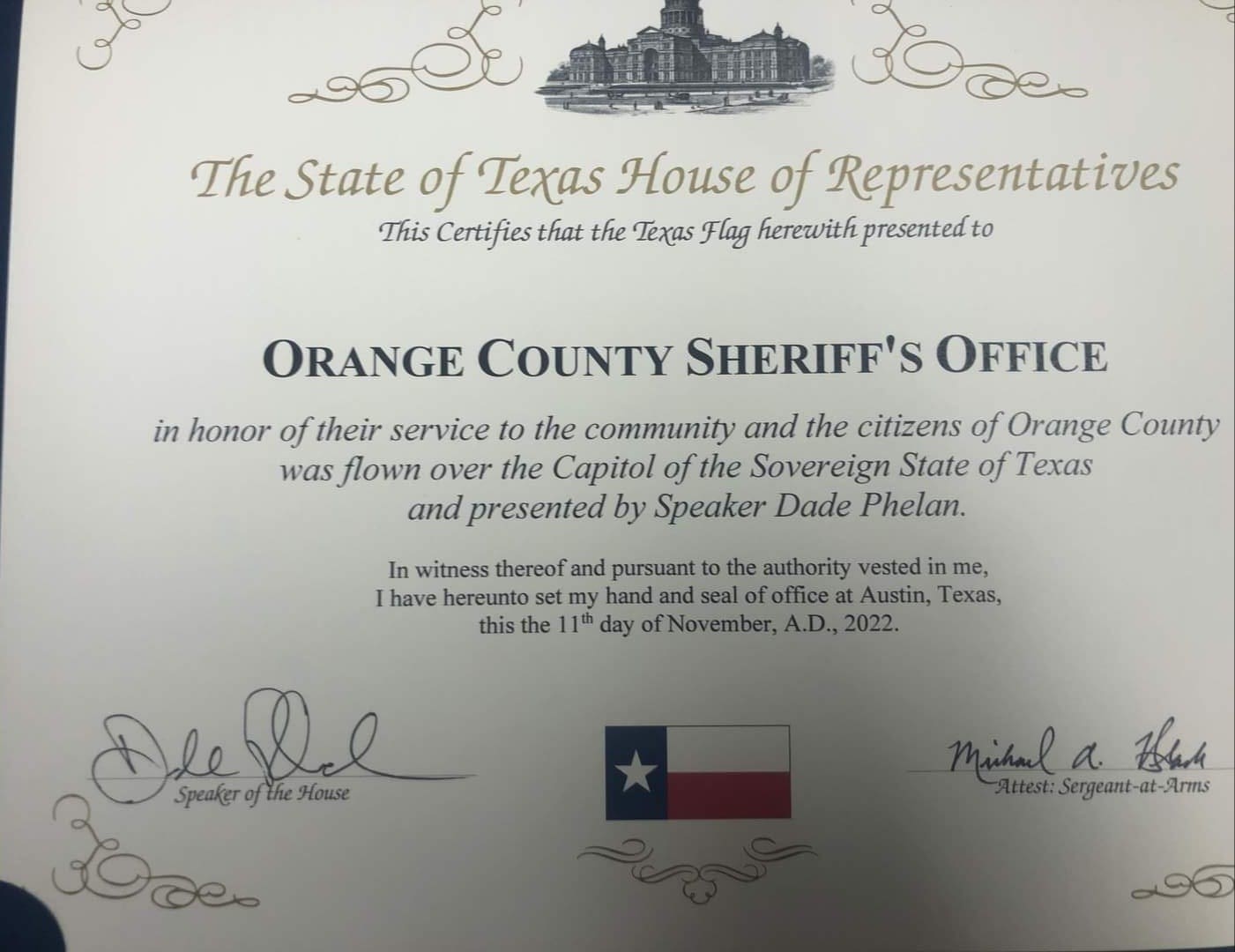 Speaker Phelan and Sheriff Mooney appear to have some contact with each other. On January 20, 2023, a representative from Speaker Phelan’s office presented Sheriff Mooney and the Orange County sheriff’s office with a certificate from the Texas House and a state flag that had flown over the Capitol.