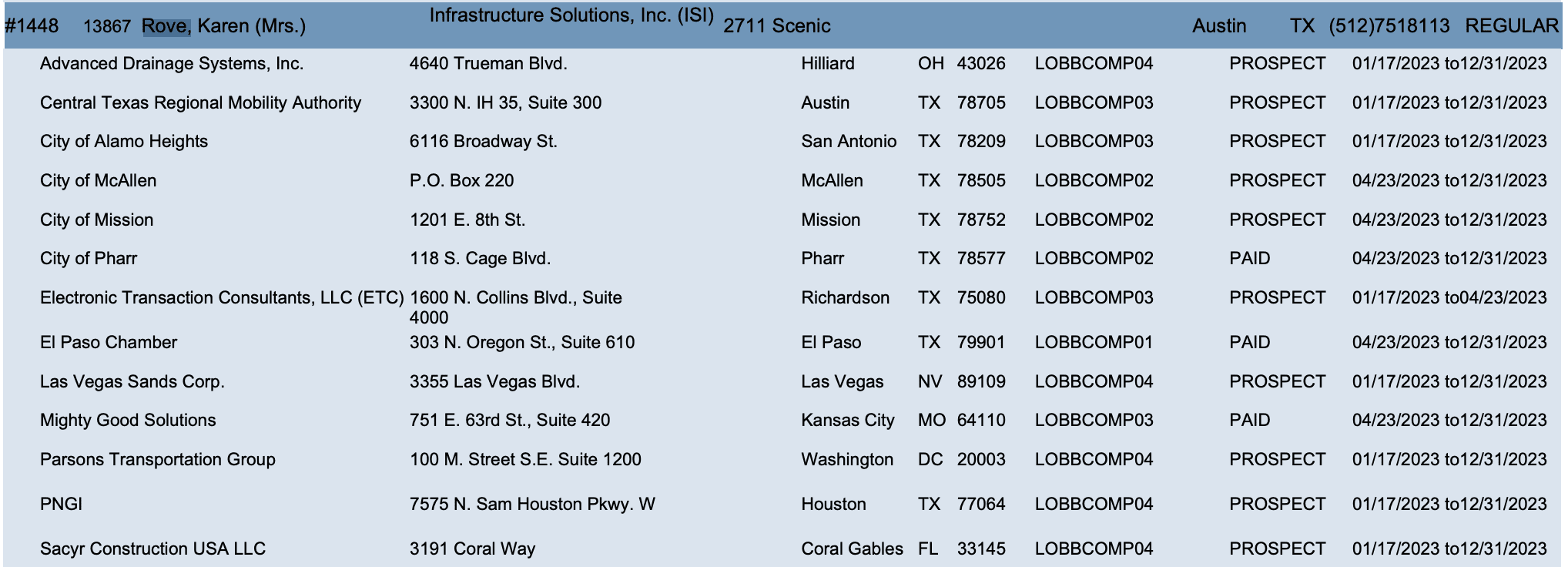Transparency USA also showed that Karen Rove is a taxpayer-funded lobbyist for multiple Texas local governments, including the cities of McAllen, Alamo Heights, and the Central Texas Regional Mobility Authority.