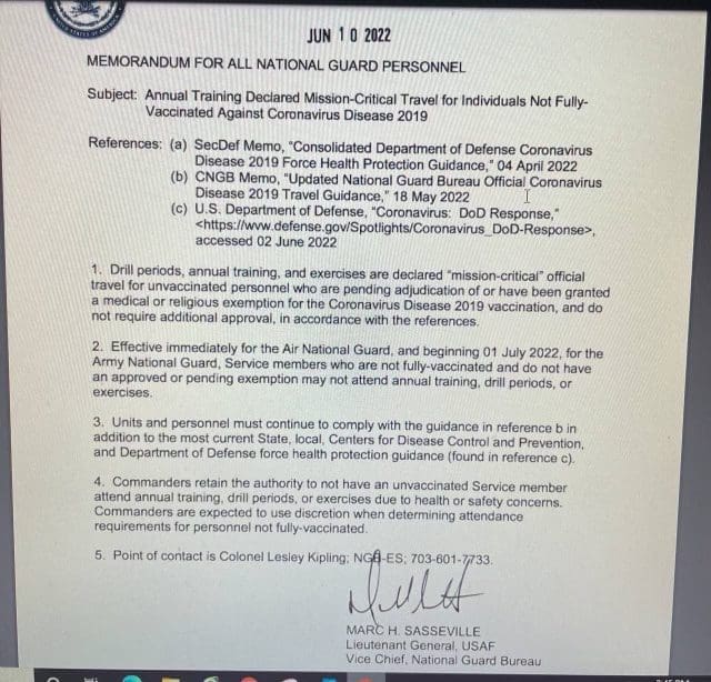 Sgt. Peters shared with us what appears to be a memo, dated June 10, 2022, signed by Lt. Gen. Marc Sasseville, Vice Chief of the National Guard Bureau. This memo addressed COVID-19 vaccination policy for “all national guard personnel.”