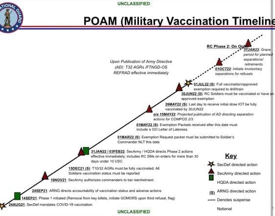 Blair shared with us what appears to be a timeline from the National Guard Bureau for the military vaccine mandate. Key dates of note are March 1, 2022, when exemption requests must be submitted by; July 1, 2022, when full vaccination or approved exemptions are required to drill or train; and October 1, 2022, when the Secretary of the Army is to “initiate involuntary separations for refusals.” January 31, 2023 is the “grace period” deadline “for planned separations/retirements.”