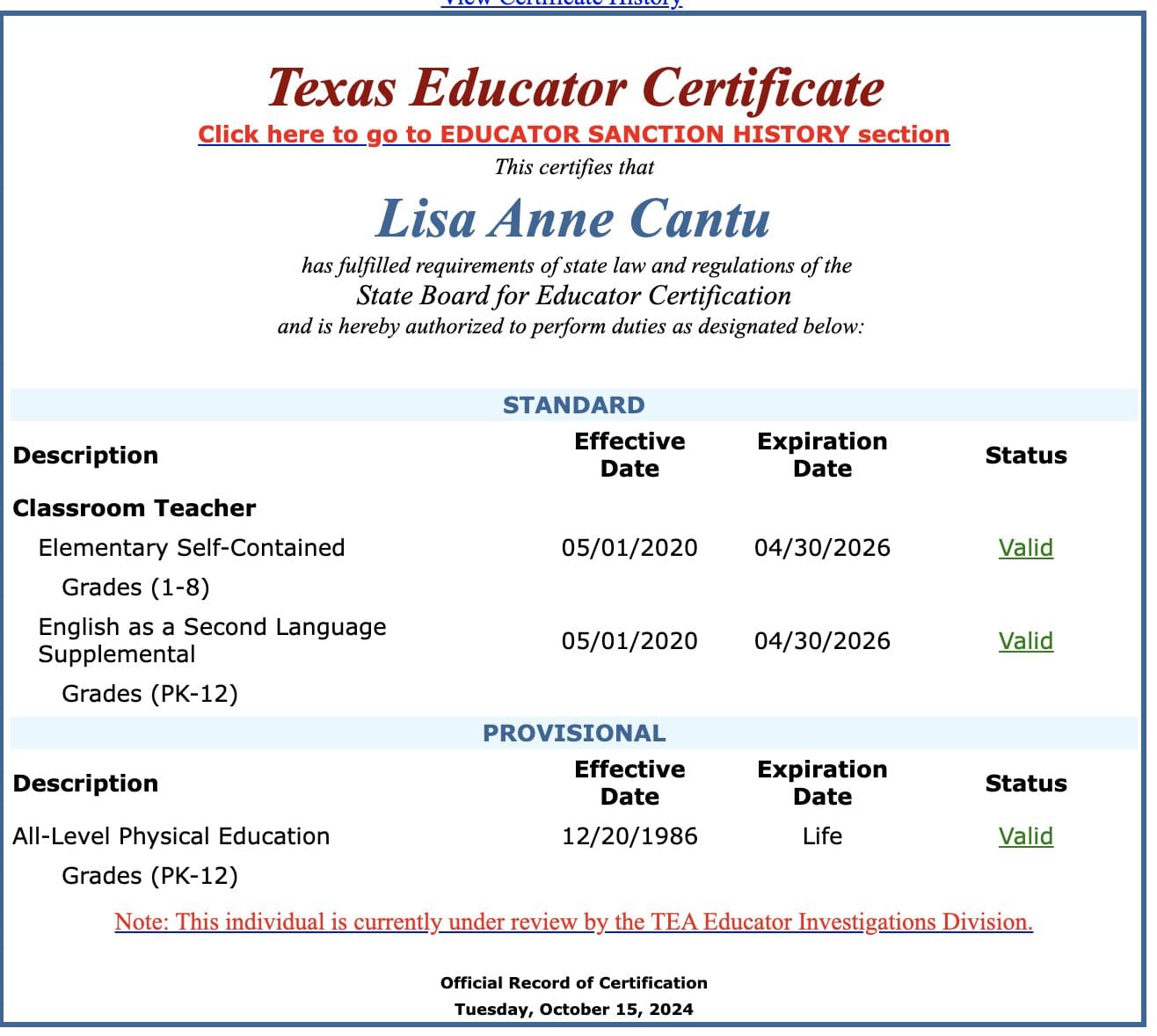 A search of the Texas Education Agency found that Cantu has a Teacher Educator Certificate.
