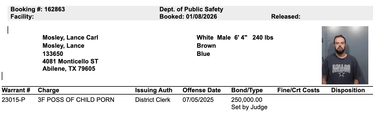 Abilene ISD is aware of the arrest of Lance Mosley on Thursday, January 8. As soon as the district received notice of his arrest from law enforcement, we acted immediately to remove Mr. Mosley’s access to our students and ensure that he was never on campus today.