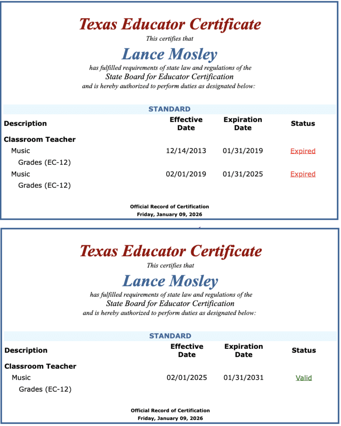 He has held a Texas teaching certificate for music since 2013, which was renewed in February 2025.