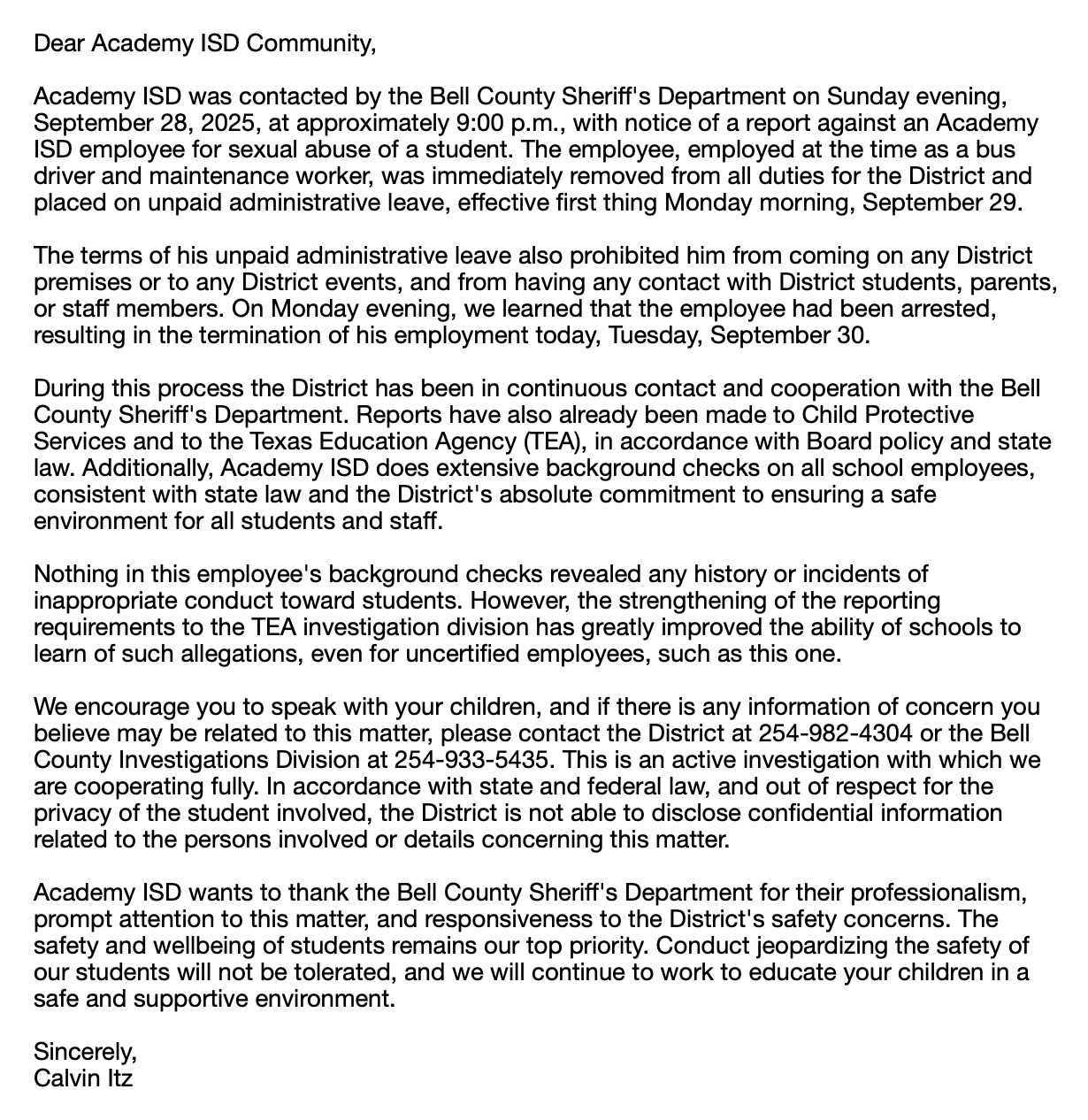 Additionally, Academy ISD does extensive background checks on all school employees, consistent with state law and the District’s absolute commitment to ensuring a safe environment for all students and staff. Nothing in this employee’s background checks revealed any history or incidents of inappropriate conduct toward students. However, the strengthening of the reporting requirements to the TEA investigation division has greatly improved the ability of schools to learn of such allegations, even for uncertified employees, such as this one.