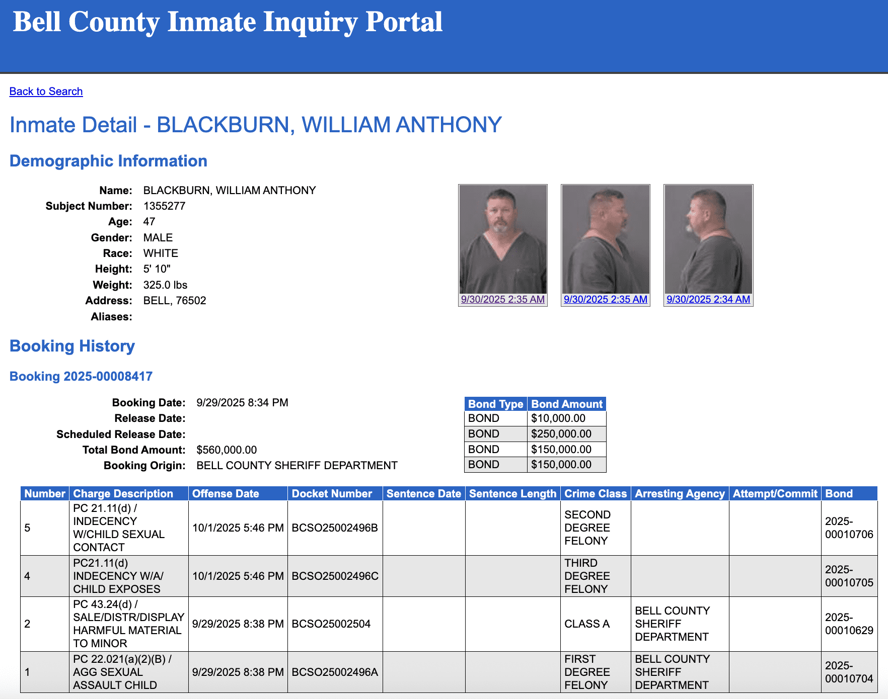 Blackburn was booked into the Bell County Jail on September 29. Additional charges were filed on October 1. The total bond amount for all four charges is $560,000.