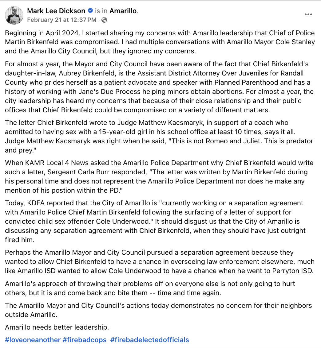 “Perhaps the Amarillo Mayor and City Council pursued a separation agreement because they wanted to allow Chief Birkenfeld to have a chance in overseeing law enforcement elsewhere, much like Amarillo ISD wanted to allow Cole Underwood to have a chance when he went to Perryton ISD,” Dickson posted on social media.