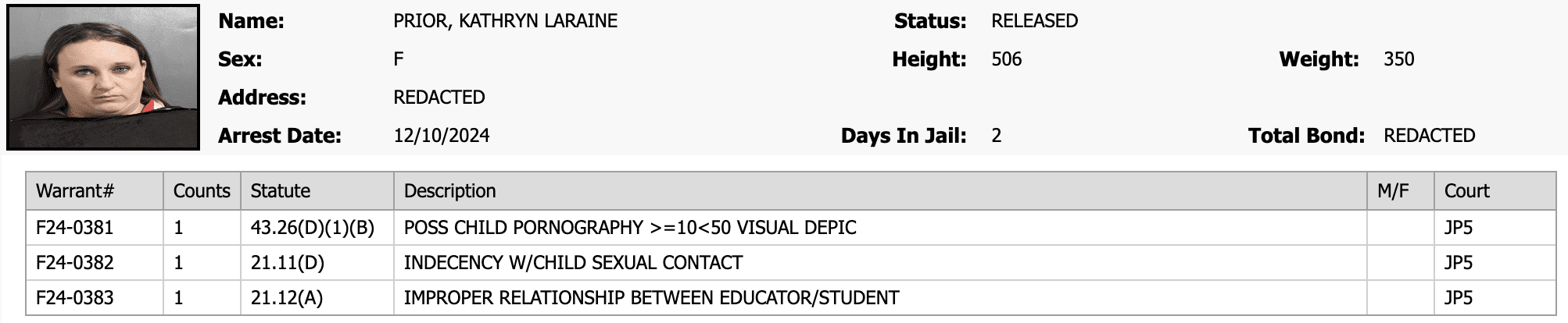 Prior was booked into the Rusk County Jail on Tuesday, December 10, and charged with indecency with a child by sexual contact and improper relationship between educator and student. Both are second-degree felonies punishable by 2-20 years in prison.