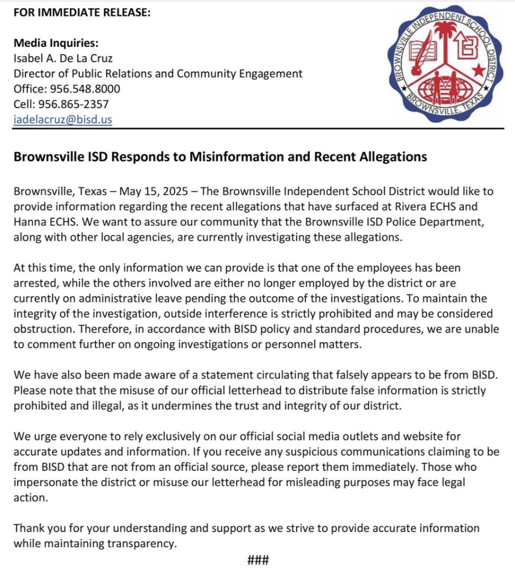 At the time of Trujillo’s arrest, Brownsville ISD officials confirmed that other employees at Rivera Early College High School and Hanna Early College High School were also under criminal investigation.