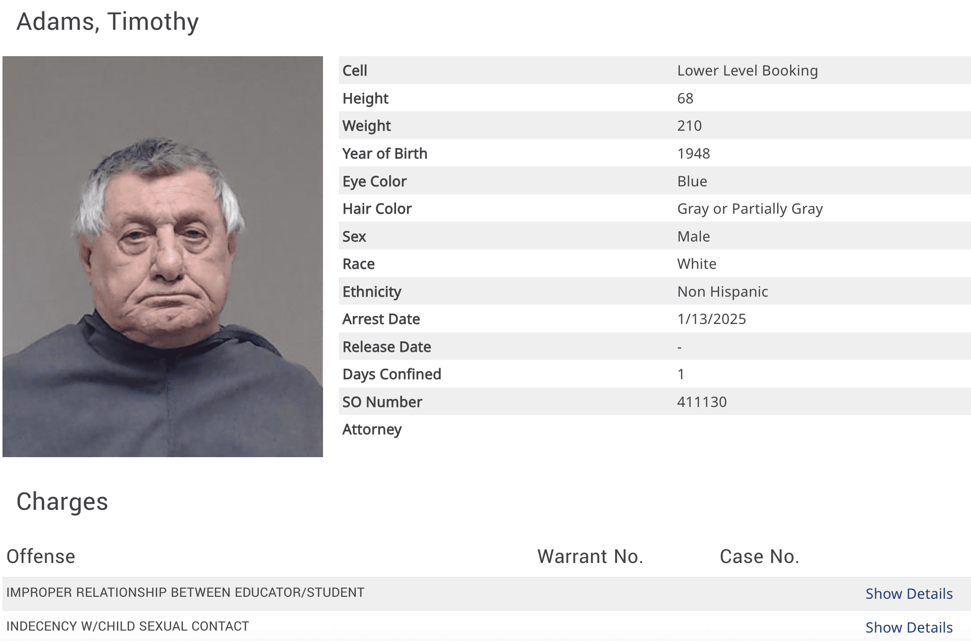 Timothy Adams, 76, was arrested Monday by Celina Police and charged with indecency with a child by sexual contact and improper relationship between educator and student.