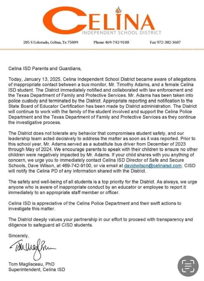 In a message to parents, Celina ISD Superintendent Tom Maglisceau said district officials became aware of the allegations on January 13 and acted “immediately” to notify authorities and fire Adams.