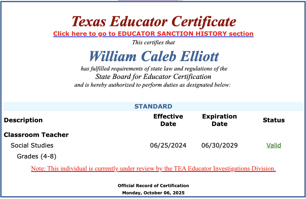 State records show Elliott holds a Texas teaching certificate, which is under review by the Texas Education Agency.
