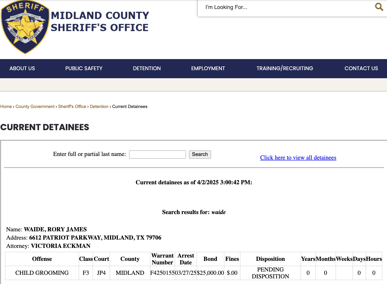 Waide was arrested and booked into the Midland County Jail on March 27 where he is being held on a $25,000 bond.