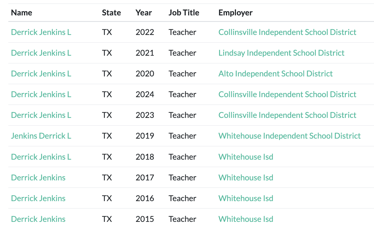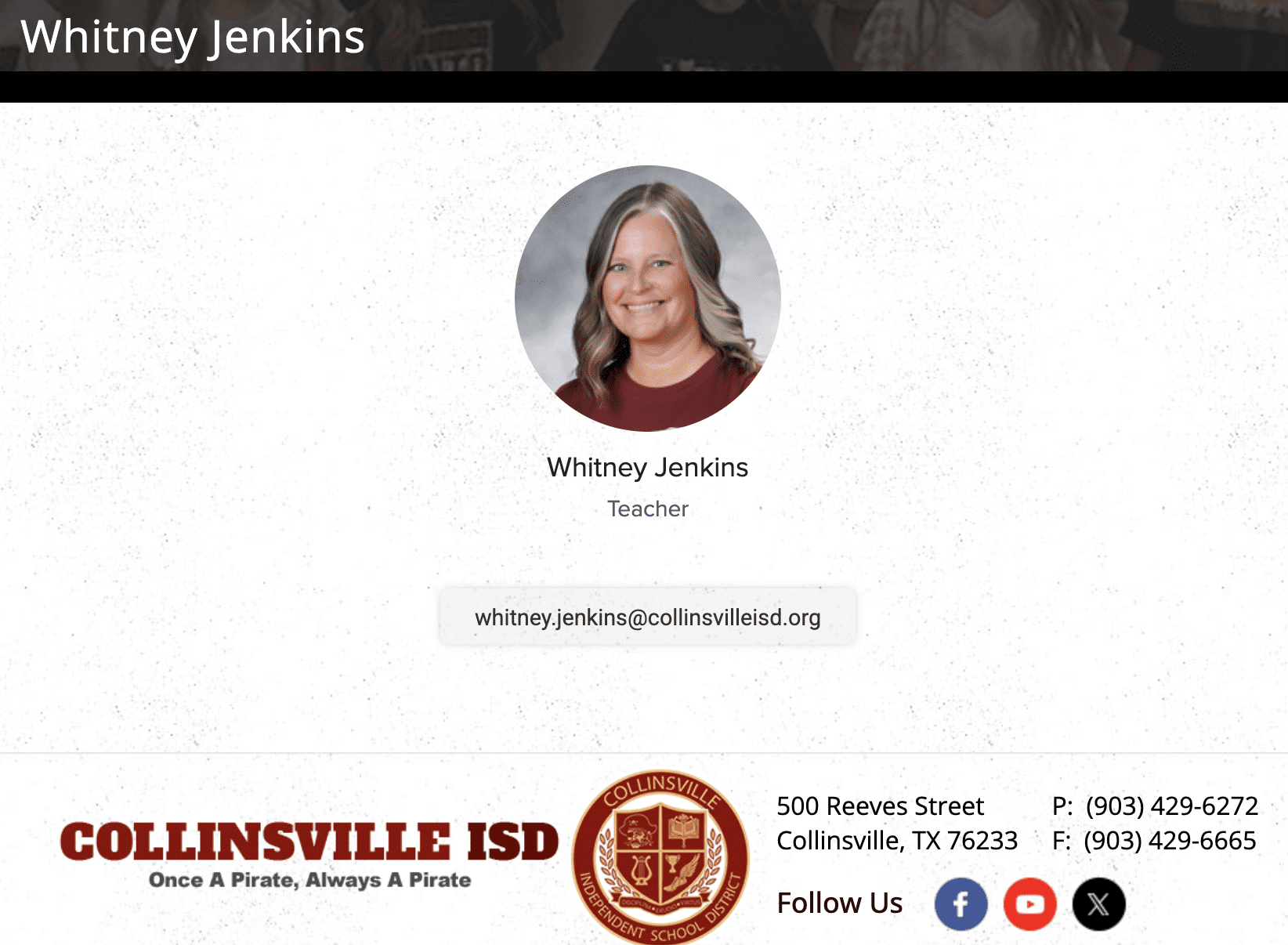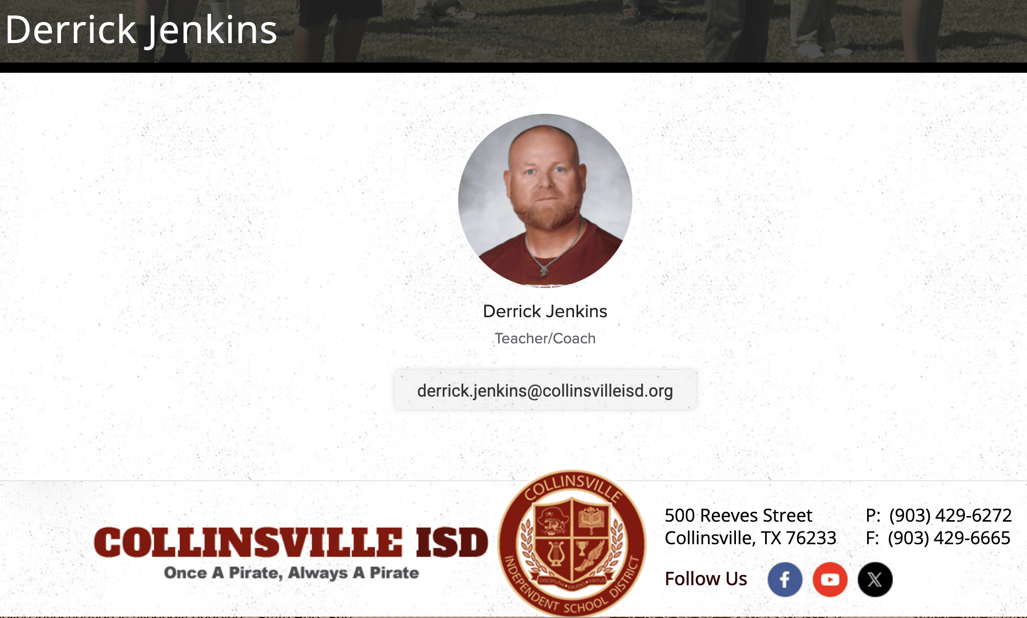 Jenkins remains listed in the Collinsville ISD staff directory but has reportedly relocated to Hughes Springs.