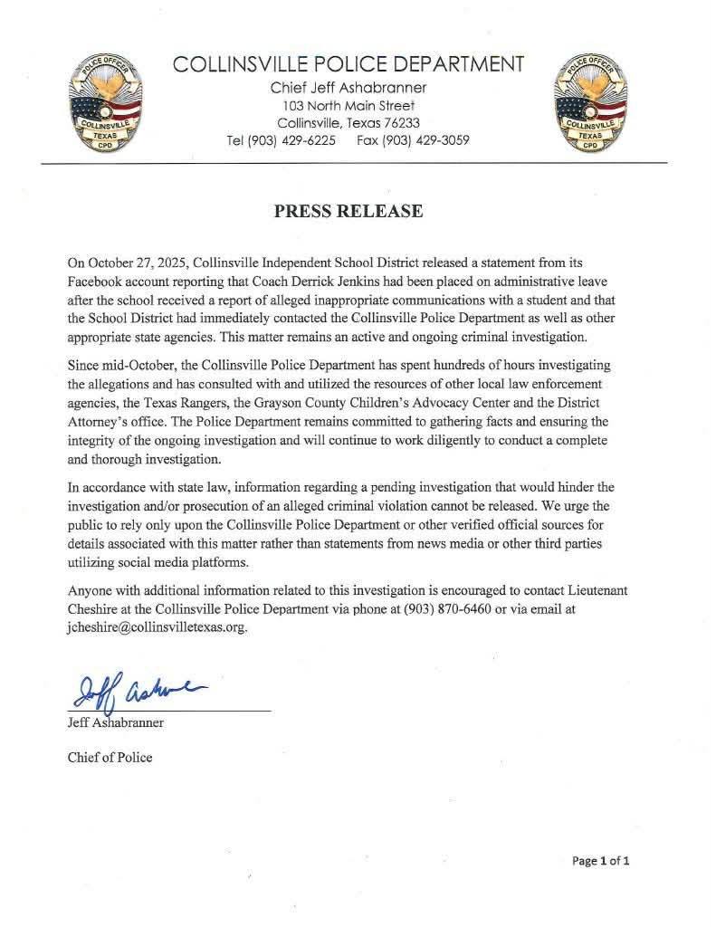 Collinsville ISD Superintendent Matthew Davenport placed Jenkins on paid administrative leave on October 20, 2025, in response to allegations that the coach was engaging in inappropriate communications with female students via social media apps including Instagram and Snapchat.