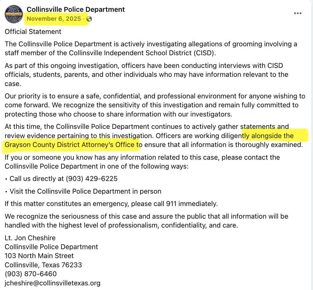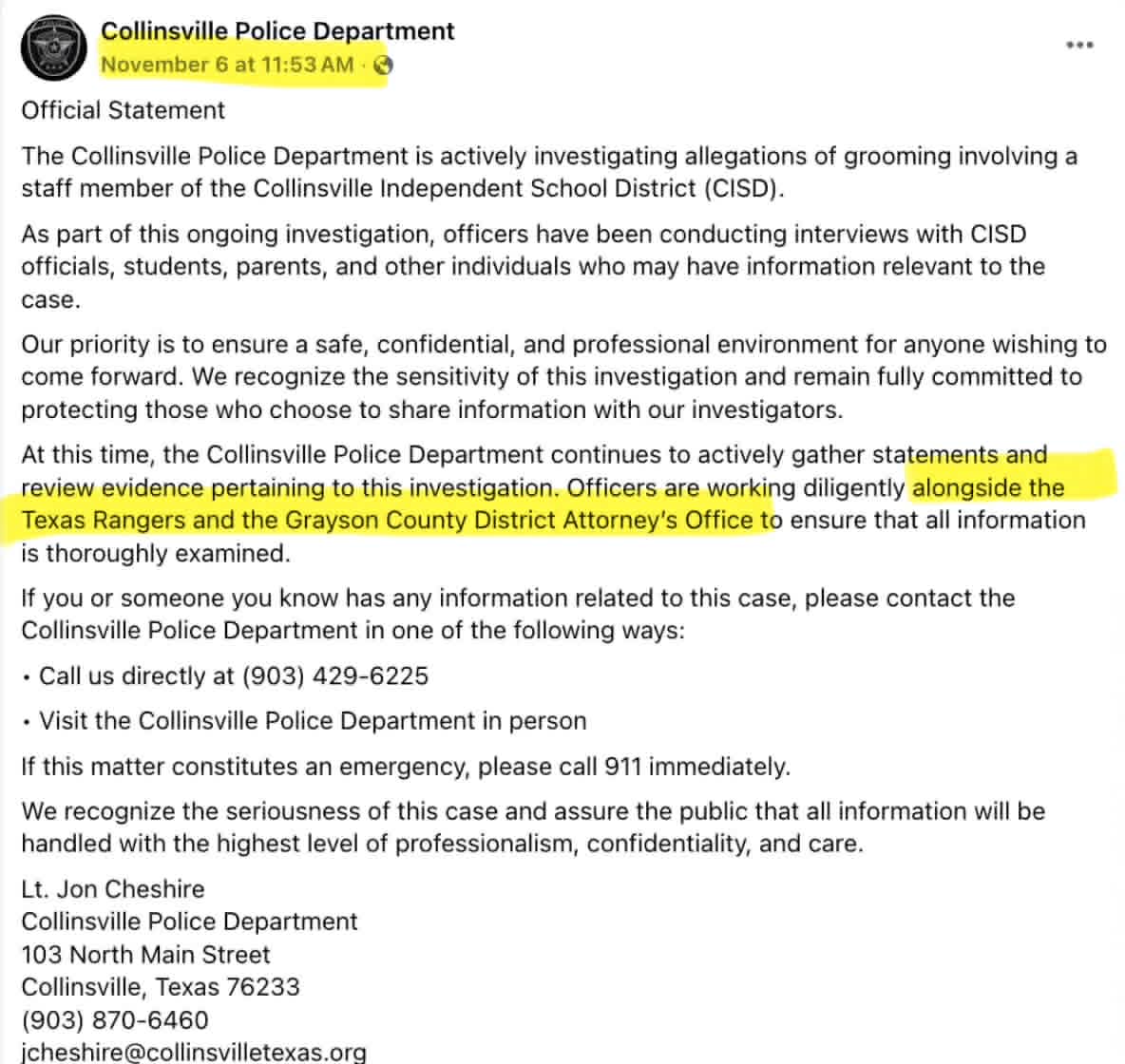 On November 6, Collinsville Police posted an “official statement” on Facebook advising that the department was “actively investigating allegations of grooming” involving a Collinsville ISD staff member and a student.