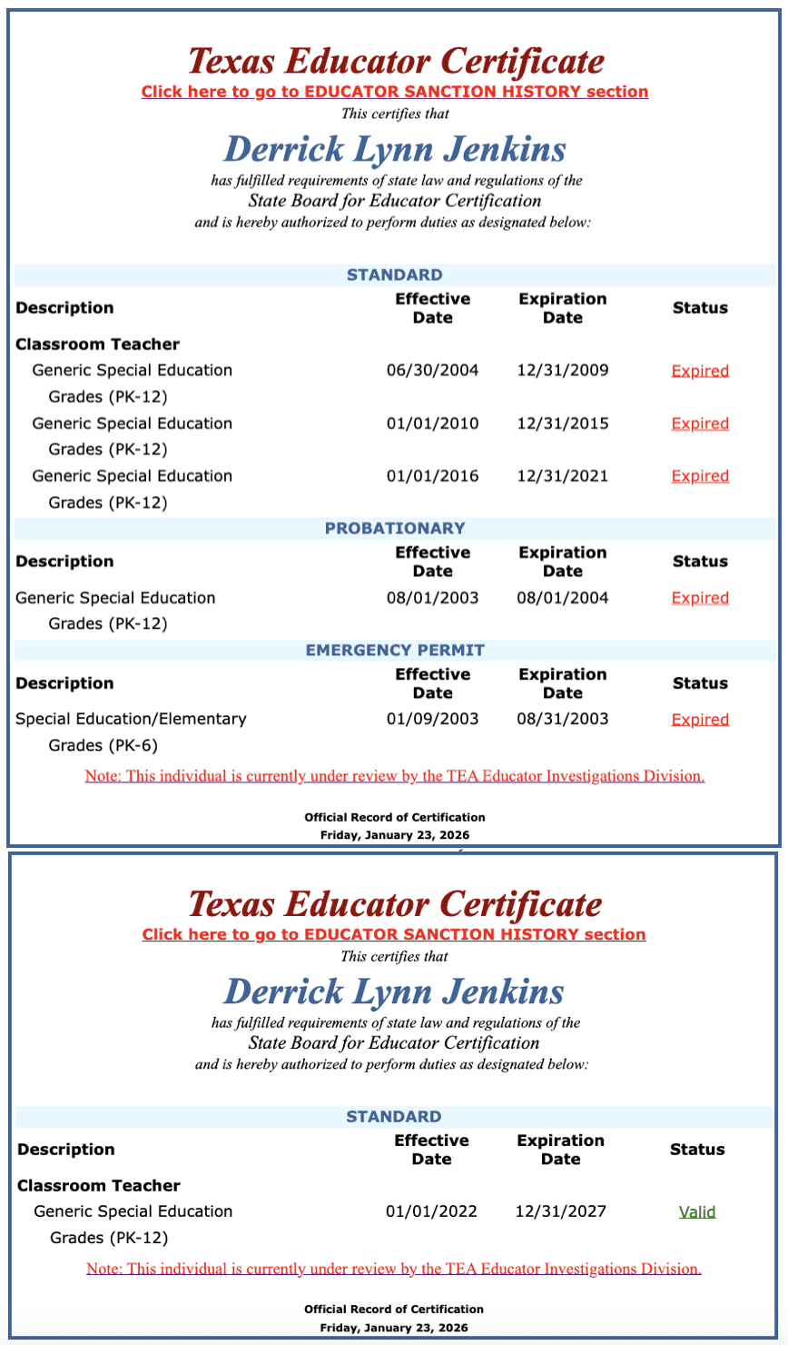 Jenkins has been certified to teach special education since 2003. He previously worked in Whitehouse, Alto, and Lindsay ISDs.