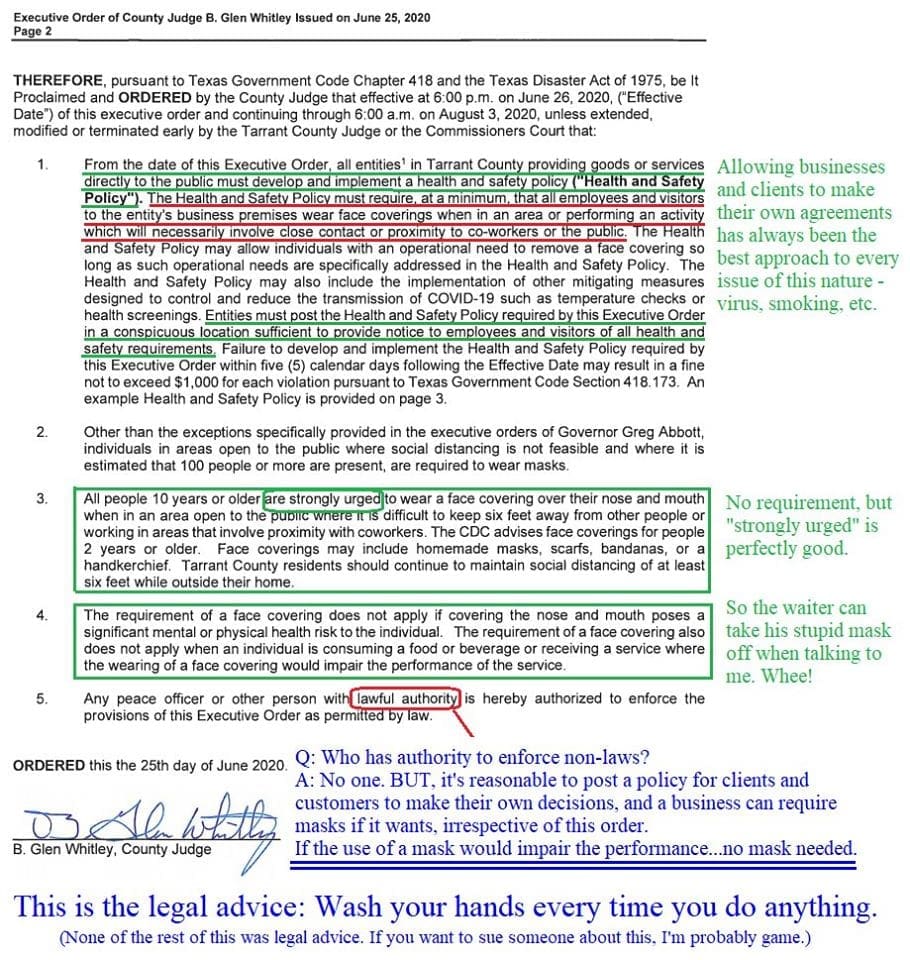 This is still all wrong because people are making law who should not be. But if I were a restaurant owner, I’d just post a policy stating that our waiters will wear a mask upon request, or even establish a mask section and a non-mask section, and meet the desires of the customer. But as a customer, I can tell you that it impairs their service. Your preferences and experience may vary.