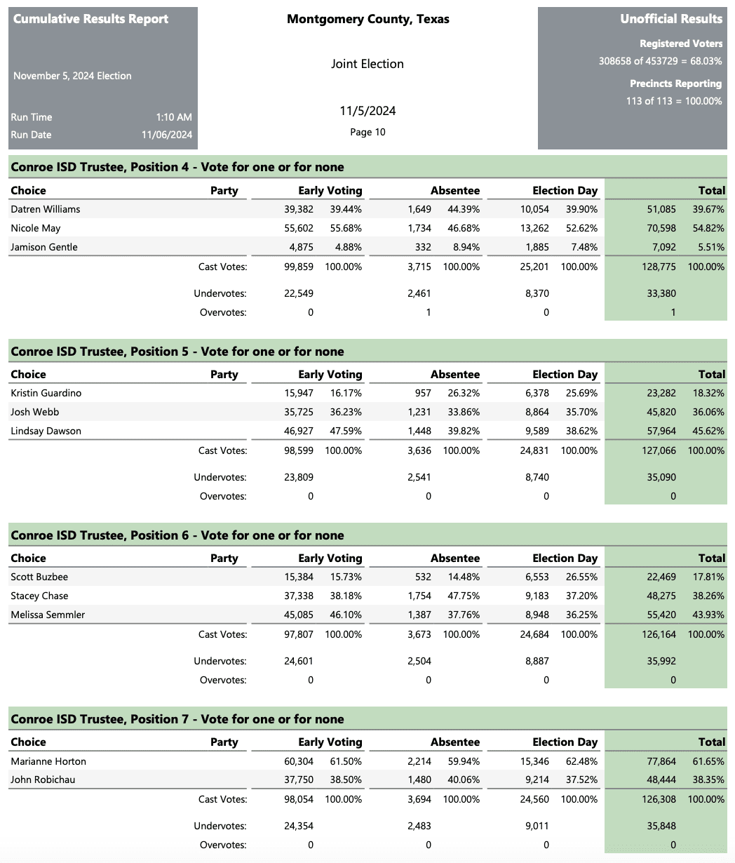 The four newly elected candidates will join Conroe ISD’s three other conservative Mama Bear trustees elected in November 2022: Melissa Dungan, Tiffany Nelson, and Misty Odenweller.