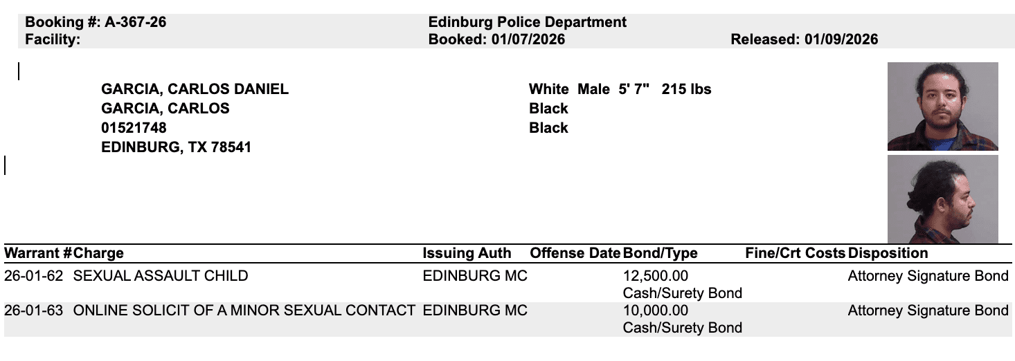 He was booked into the Hidalgo County Jail on January 7 and released January 9 on bonds totaling $22,500.