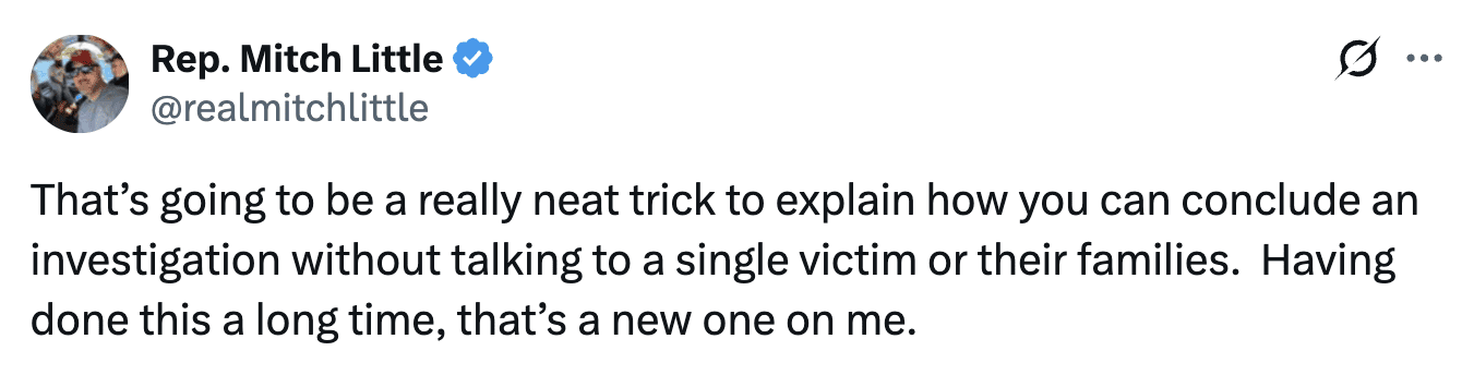 State Rep. Mitch Little (R–Lewisville), an attorney representing 17 Moore Middle School students targeted by Caleb Elliott, called the statement “self-serving” and confirmed in an X post that the investigator had not talked to “a single victim or their families.”