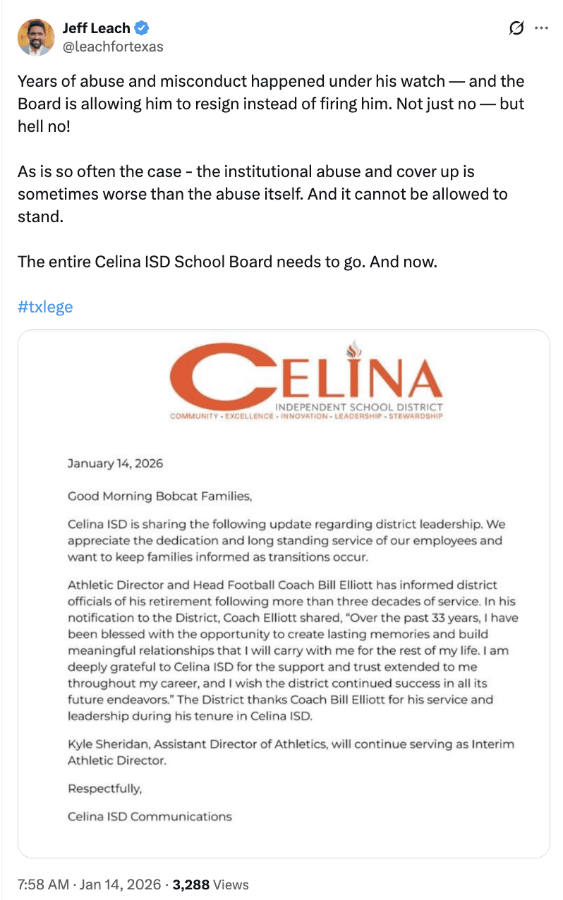 The announcement came a day after the Celina ISD school board agreed to release an investigative report on whether administrators—including Bill Elliott—hushed up alleged past misconduct by then-coach Caleb Elliott, who is charged with secretly recording undressed students in the Moore Middle School boys’ locker room.