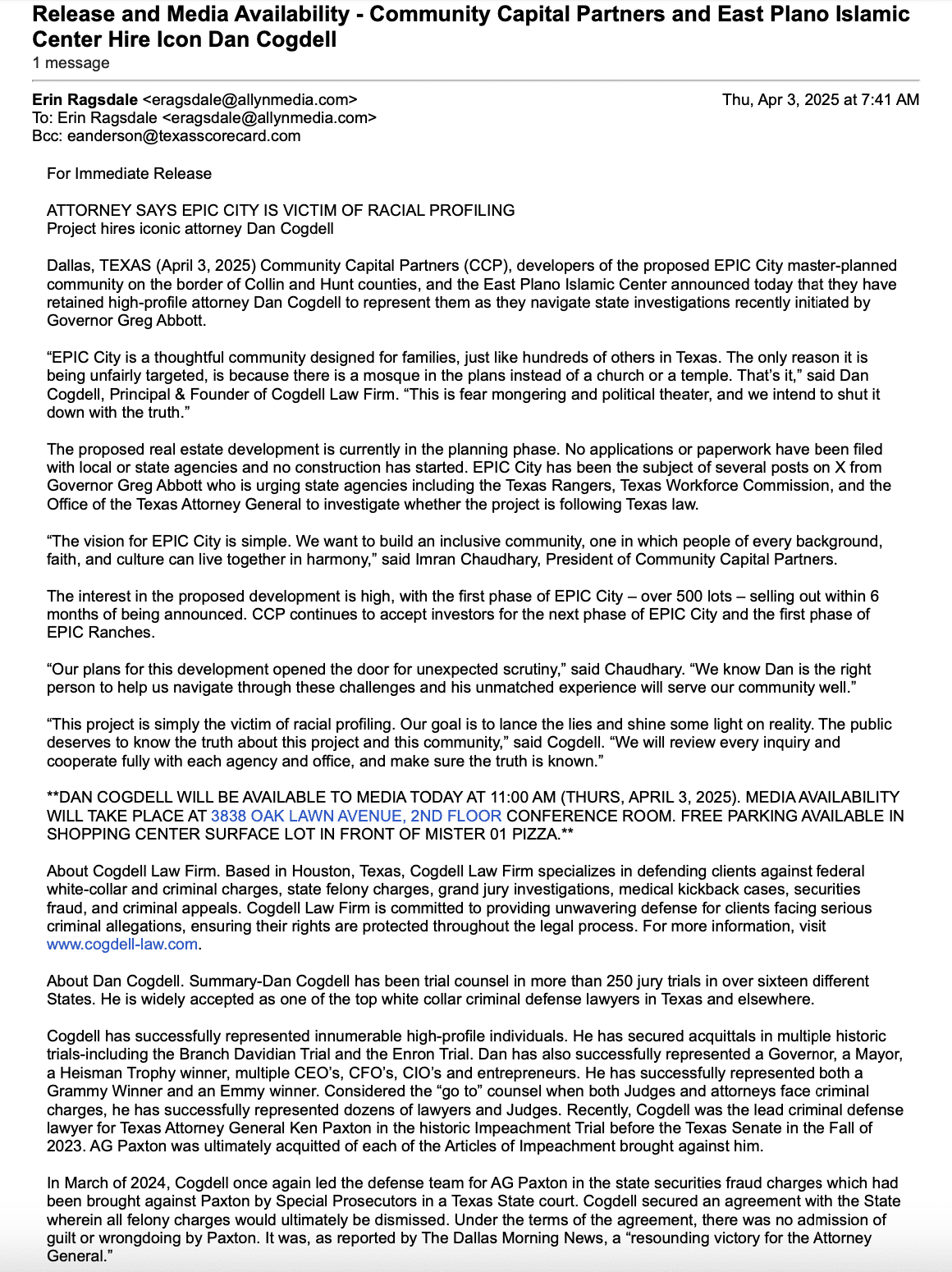 “EPIC City is a thoughtful community designed for families, just like hundreds of others in Texas. The only reason it is being unfairly targeted, is because there is a mosque in the plans instead of a church or a temple. That’s it,” said Cogdell in a statement issued Thursday by CCP’s public relations consultant Allyn Media.