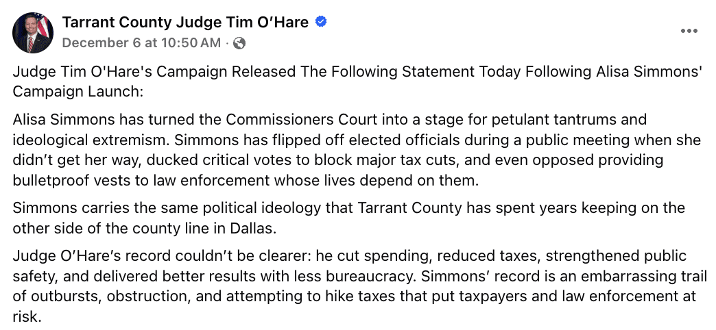 O’Hare responded that Simmons “carries the same political ideology that Tarrant County has spent years keeping on the other side of the county line in Dallas.”