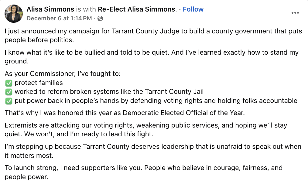 In her new county judge campaign announcement, Simmons touted her experience fighting to protect families, reform the Tarrant County Jail, and defend voting rights.