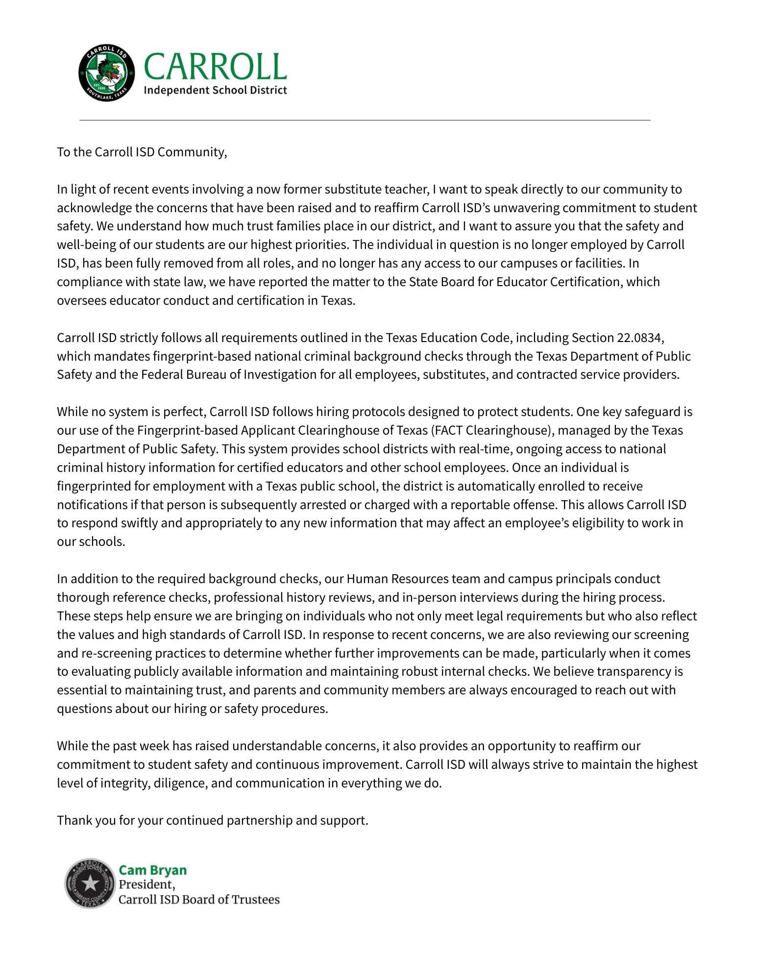 Carroll ISD Board President Cam Bryan issued a statement Tuesday that an unnamed “now former substitute teacher” was no longer employed by the district and no longer has access to any campuses or facilities.