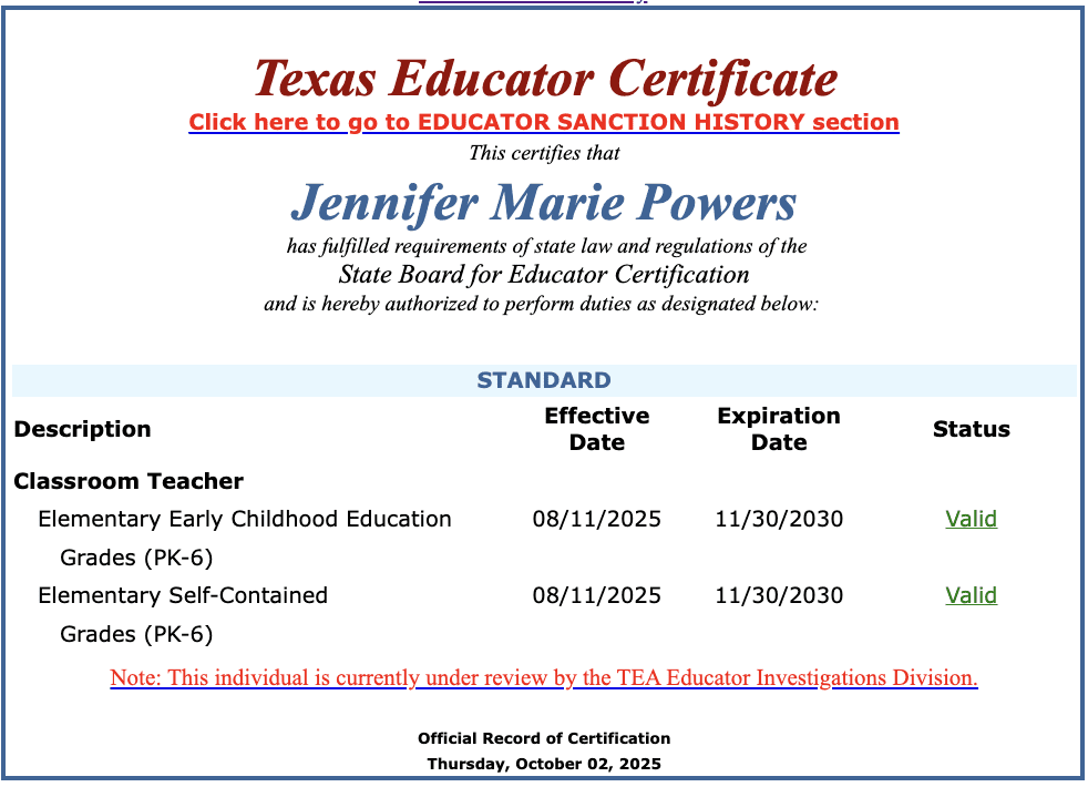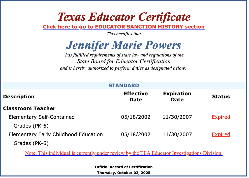 State records show Powers was first certified to teach elementary school from 2002 until 2007. She received a new certificate on August 11, 2025, which is now under review by the Texas Education Agency.