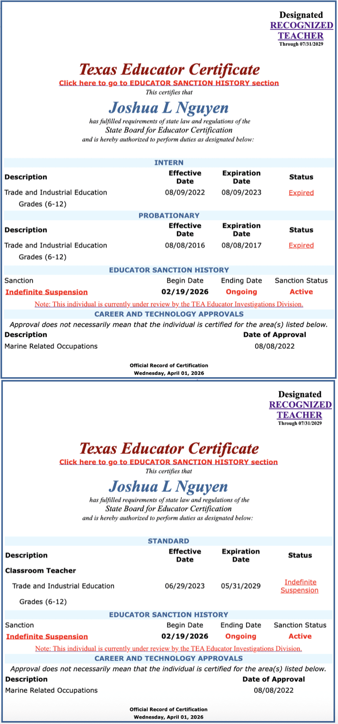 Rutledge noted that Nguyen’s teaching certificate is on “indefinite suspension,” meaning he is ineligible to work in a Texas public school in any capacity until the criminal charges against him are resolved.