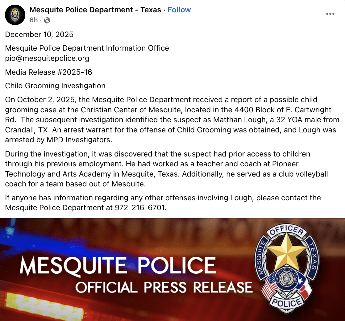 Investigators discovered that Lough had prior access to children as a teacher and coach at Pioneer Technology and Arts Academy in Mesquite. PTAA Texas is a K-12 charter school district with six campuses in North Texas, including two in Mesquite.