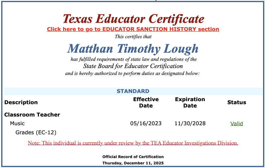 Lough holds a teaching certificate for music, which is under review by the Texas Education Agency.