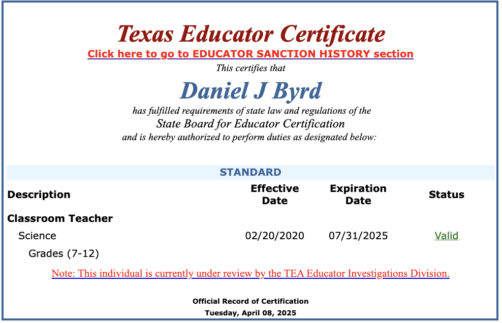 State records show Byrd’s teaching certificate is currently under review by the Texas Education Agency.