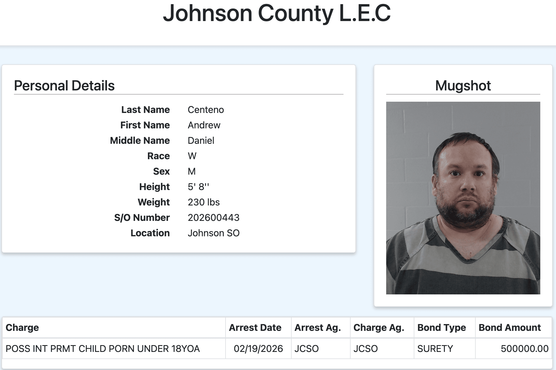 He was booked into the Johnson County Jail on February 19. Bond was set at $500,000.