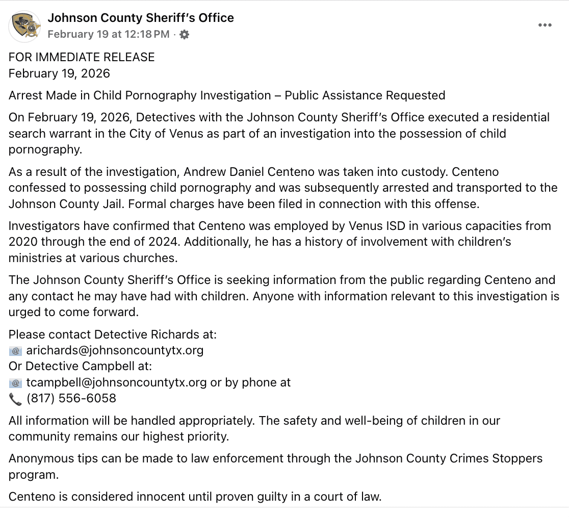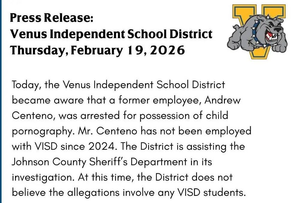 A Venus ISD press release stated that the district is assisting the Johnson County Sheriff’s Office in its investigation and at this time “does not believe the allegations involve any VISD students.”