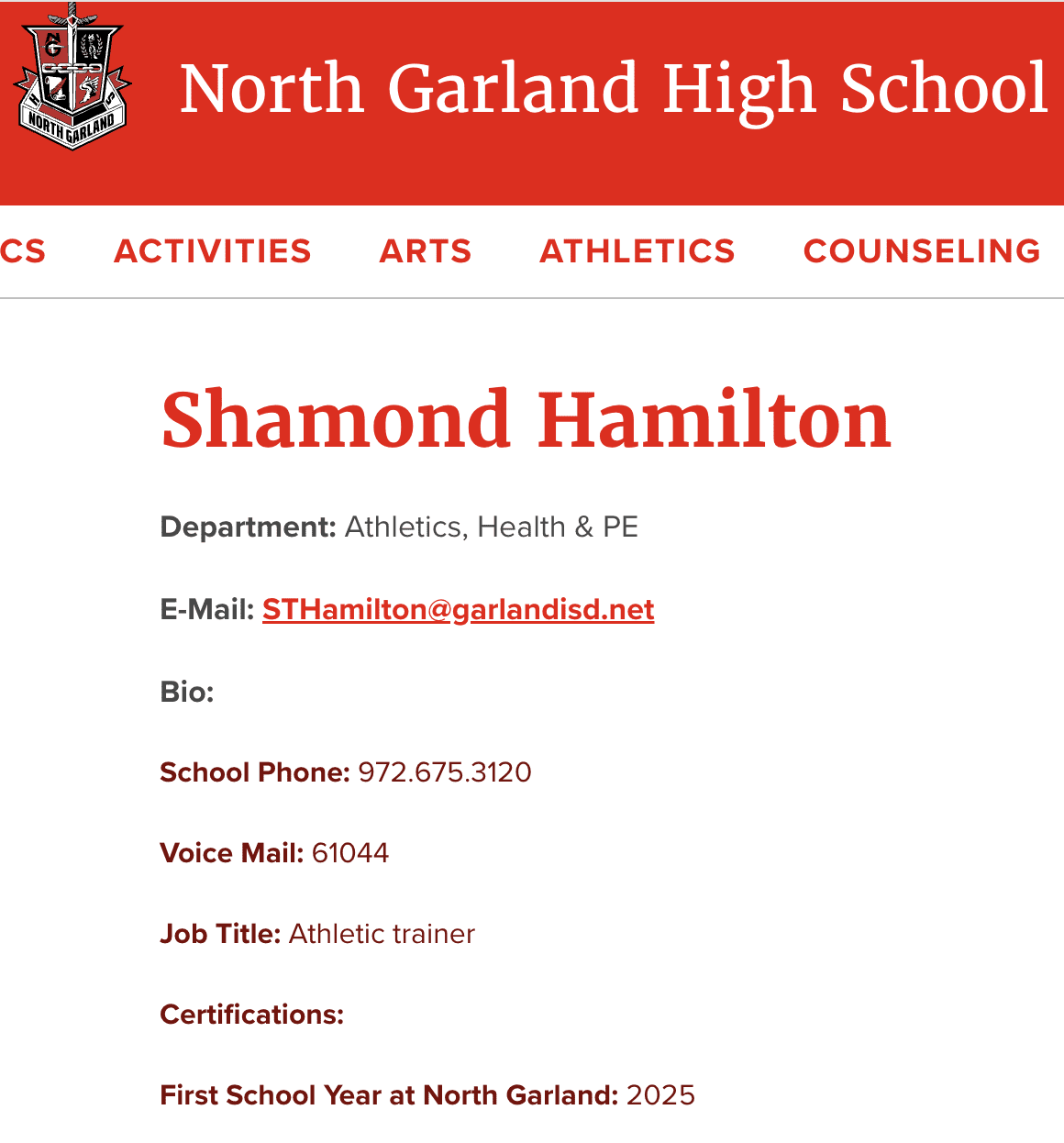 Shamond Hamilton, 26, was arrested and charged with indecency with a child by sexual contact, a second-degree felony. Hamilton began working as an athletic trainer at North Garland High School this school year.