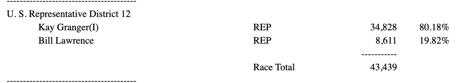 Election records dating back to 2010 from the Texas Secretary of State seem to suggest this a pattern for Granger.