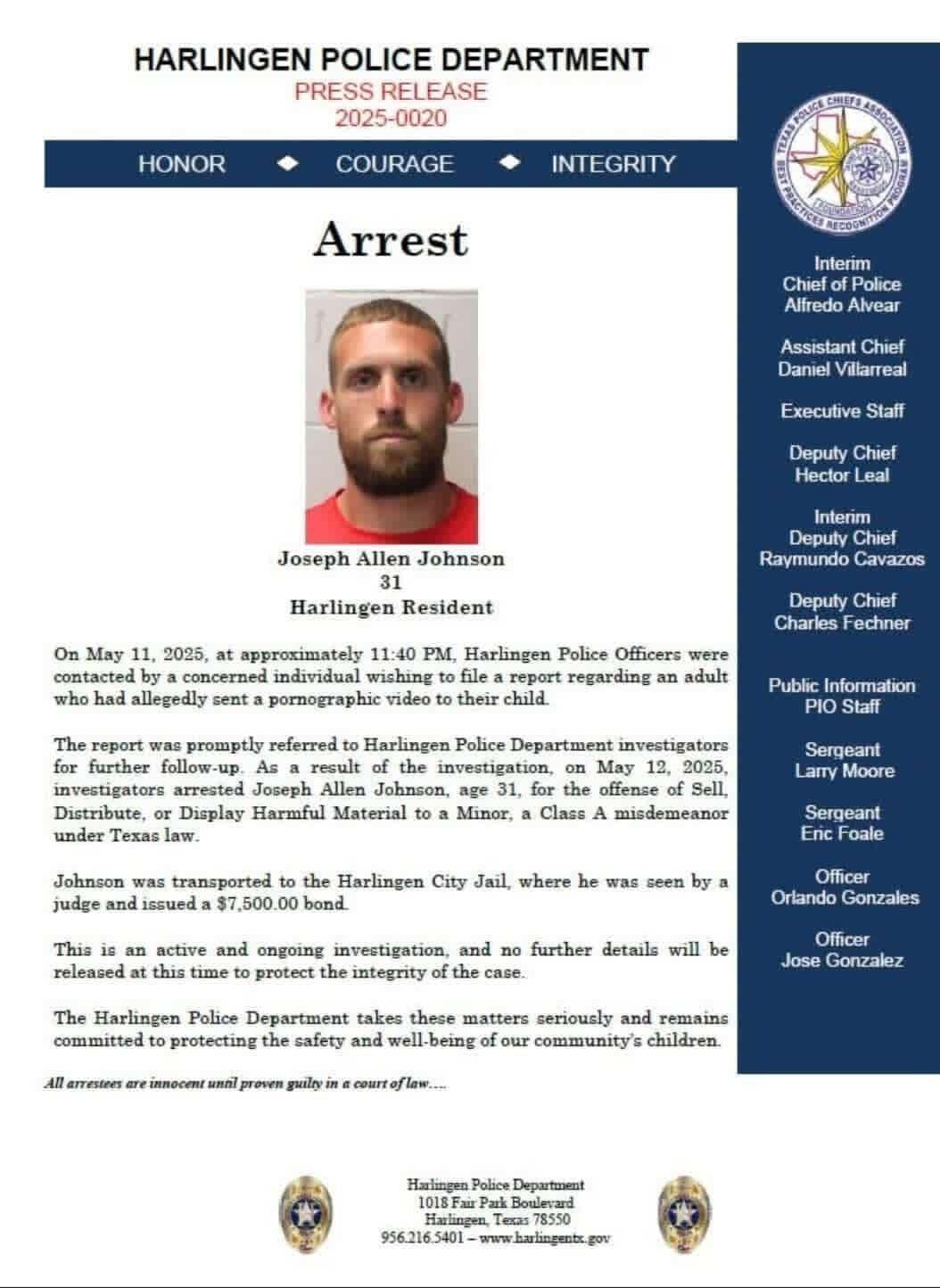 According to a press release from the Harlingen Police Department, a “concerned individual” reported to police on Sunday than an adult had sent a “pornographic video” to their child.