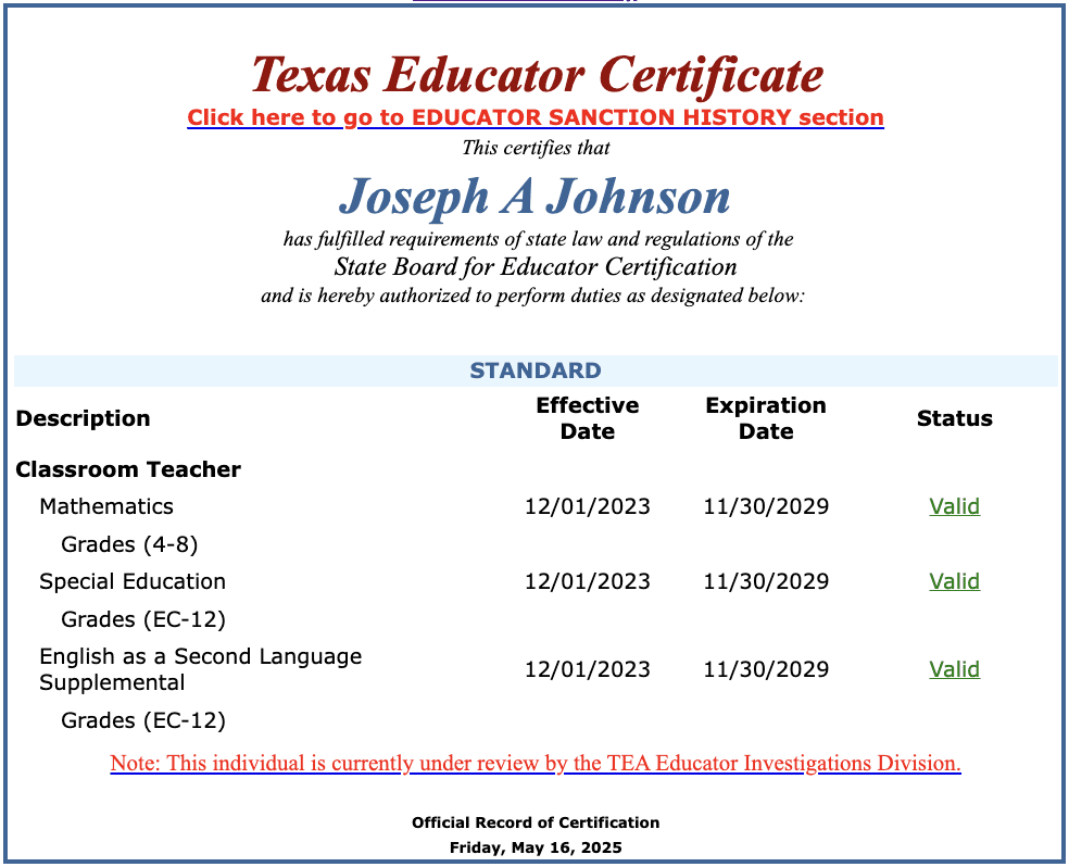State records show that a Joseph A. Johnson holds a teaching certificate that is under investigation by the Texas Education Agency.