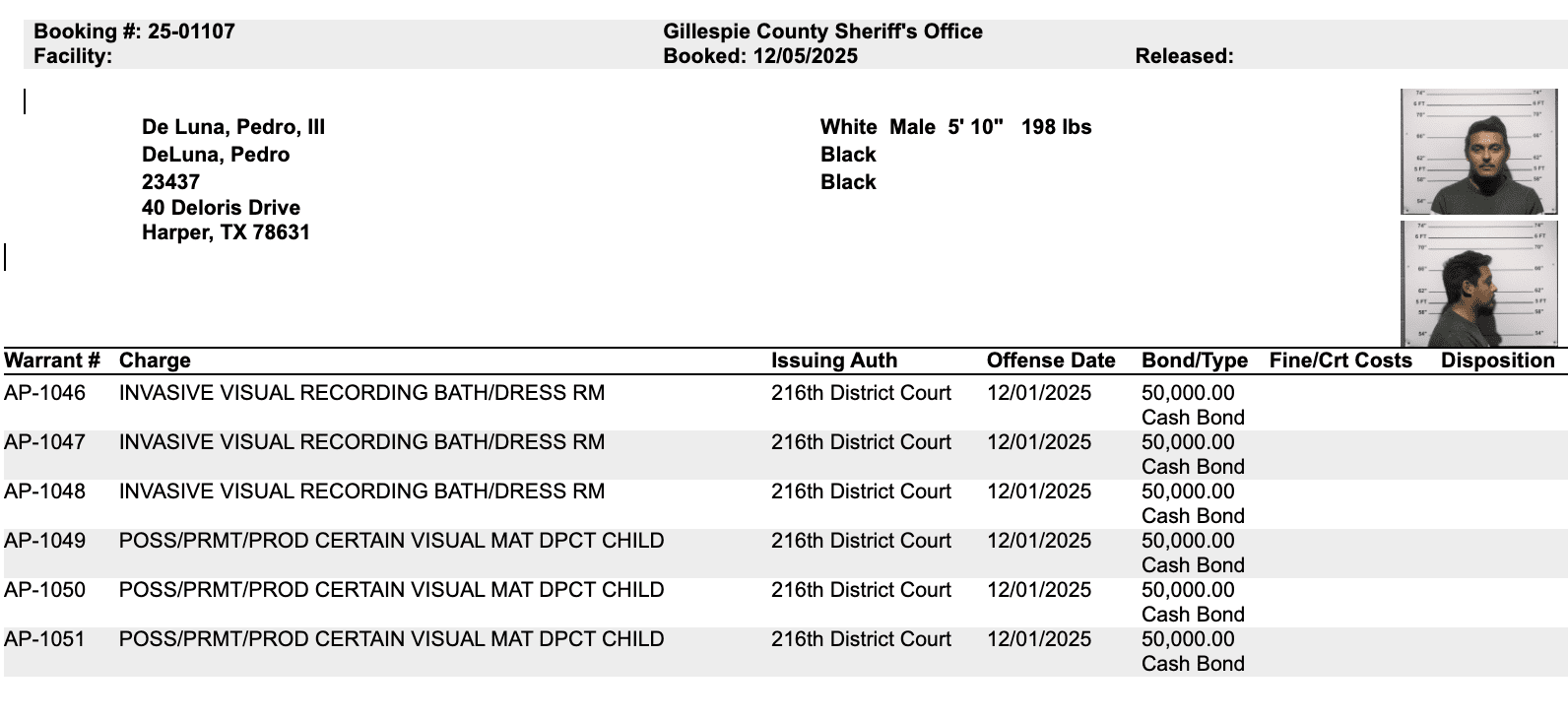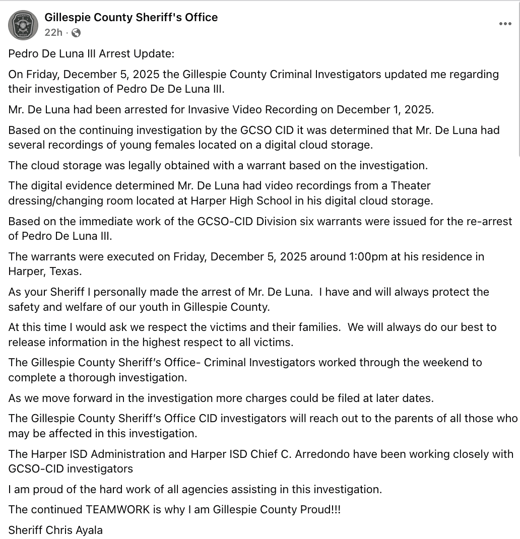 Gillespie County Sheriff Chris Ayala announced Monday that further investigation by his Criminal Investigation Division revealed DeLuna had several video recordings of “young females from a Theater dressing/changing room located at Harper High School.”