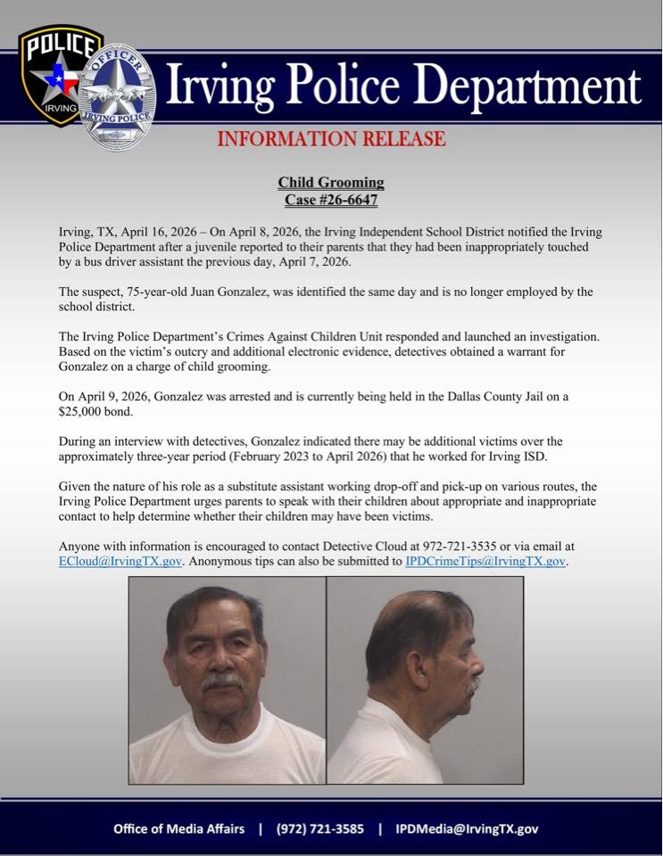 According to the police, Gonzalez is no longer employed by Irving ISD. He had worked for the district for three years, starting in February 2023.