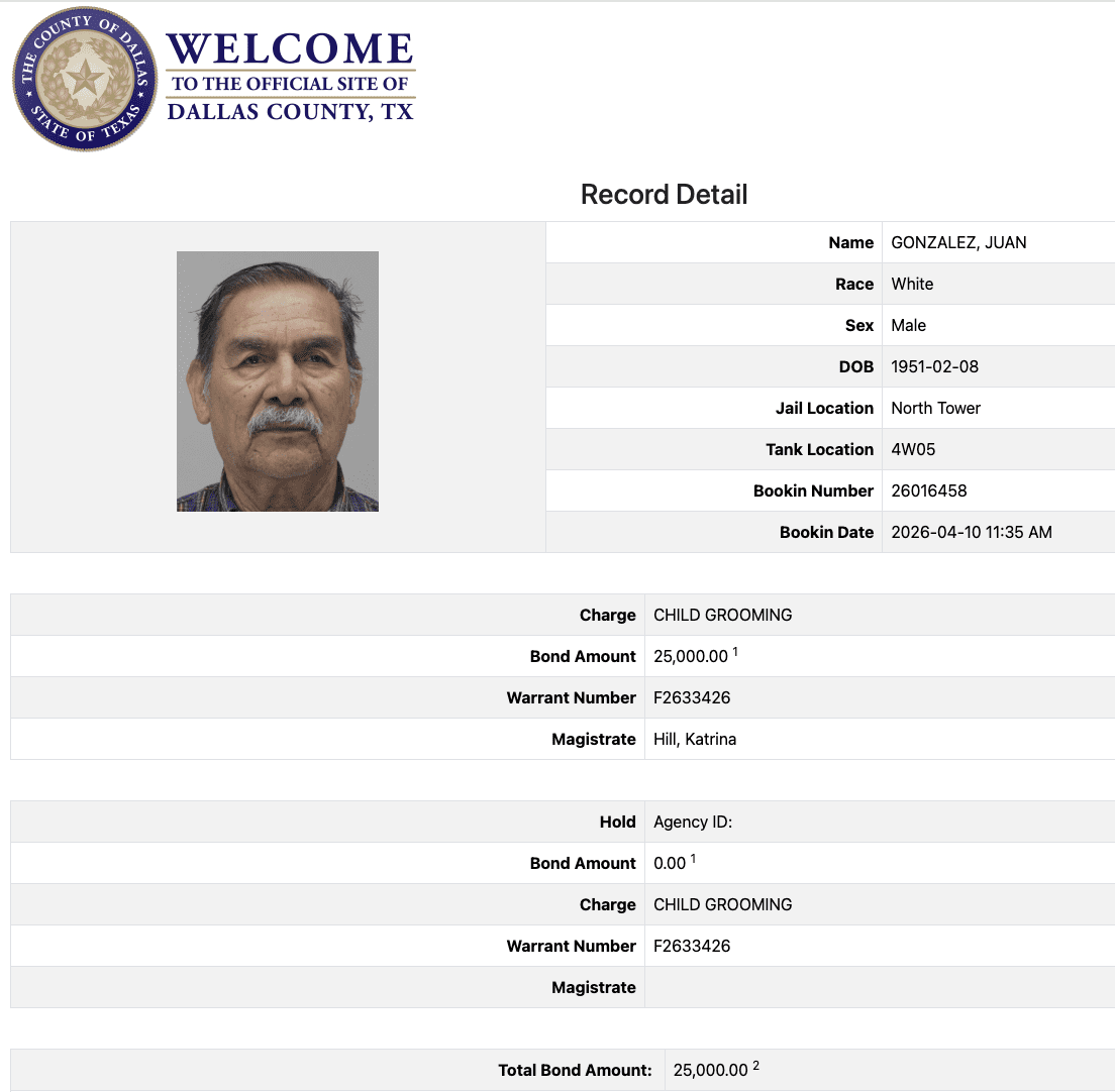 Gonzalez was arrested on April 9 and is being held in the Dallas County Jail. Bond is set at $25,000.