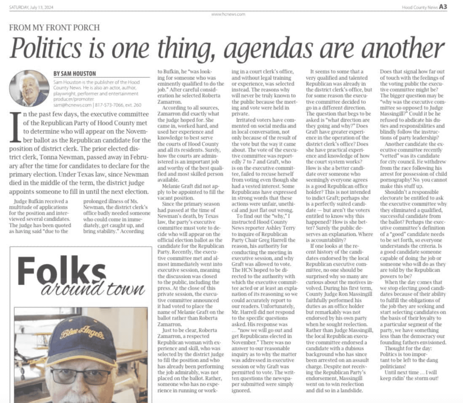 Based on the law and facts presented, the judge denied Zamarron’s demands, leaving Graft the Hood County GOP’s nominee for district clerk.