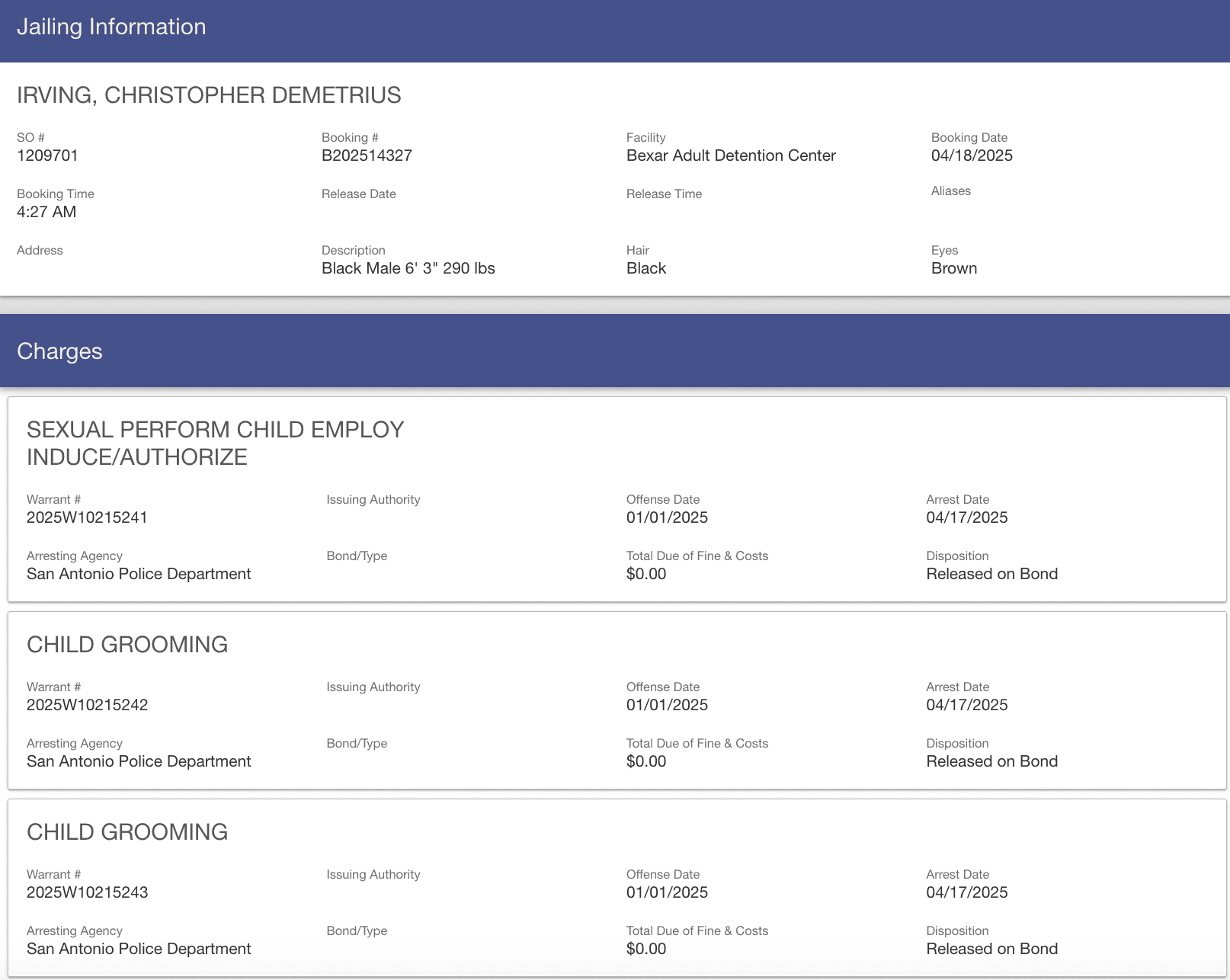 Irving was booked into the Bexar County Jail on April 18 and later released on bonds totaling $250,000.