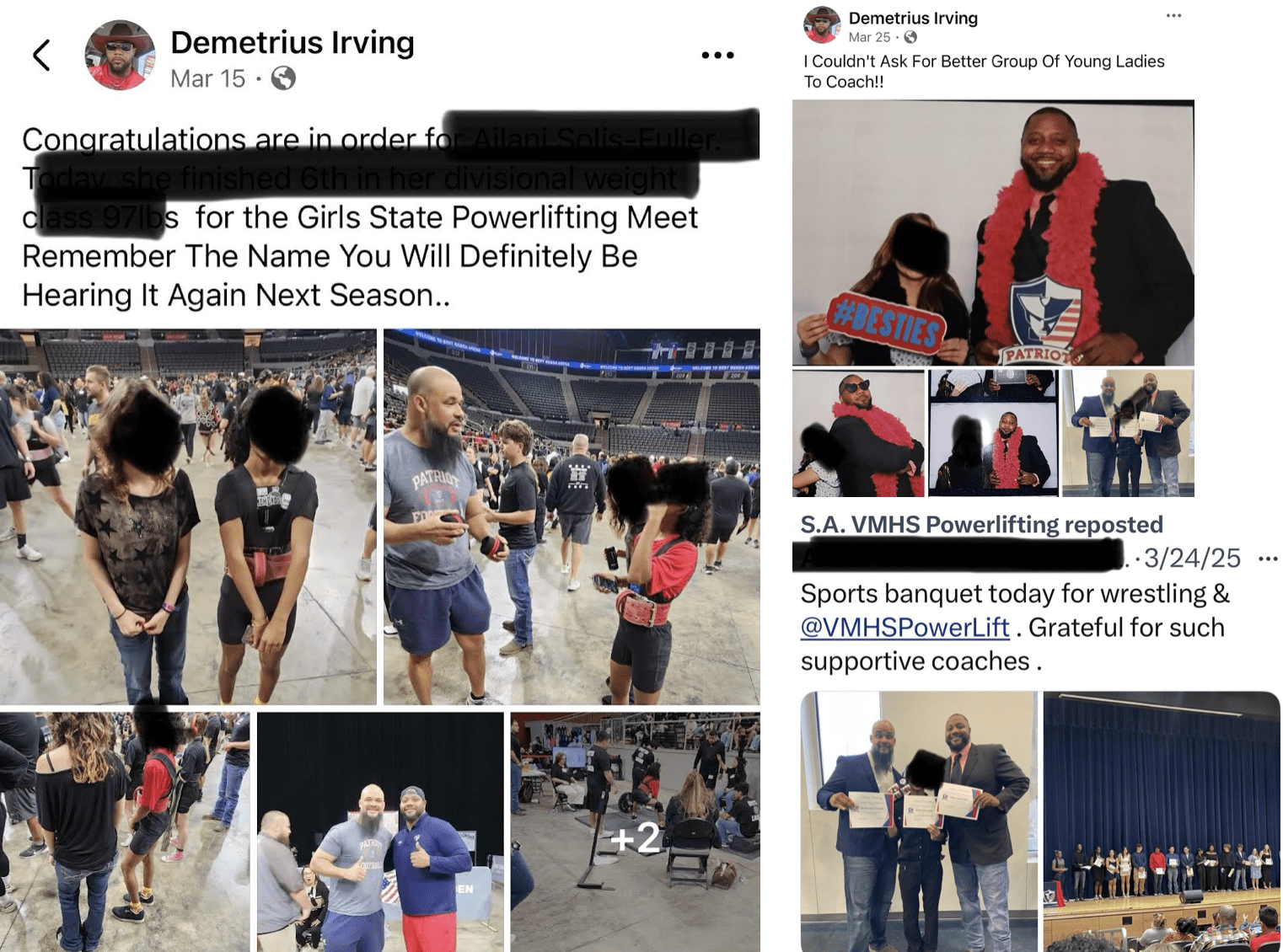 Irving attended the Texas High School Women’s Powerlifting Association state championship event on March 15 with other school students and was on campus for the March 24 sports banquet.